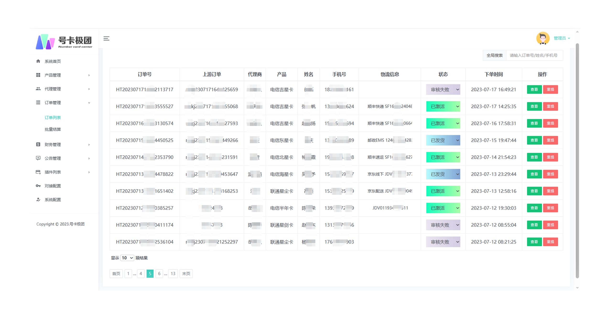 没想到系统还提供了丰富的功能模块,包括号卡上下架管理、订单管理、代理管理等,满足了用户在号卡分销过程中的各种需求。此外,系统还实时同步订单的物流信息,为用户提供了更加便捷的交易和配送体验。